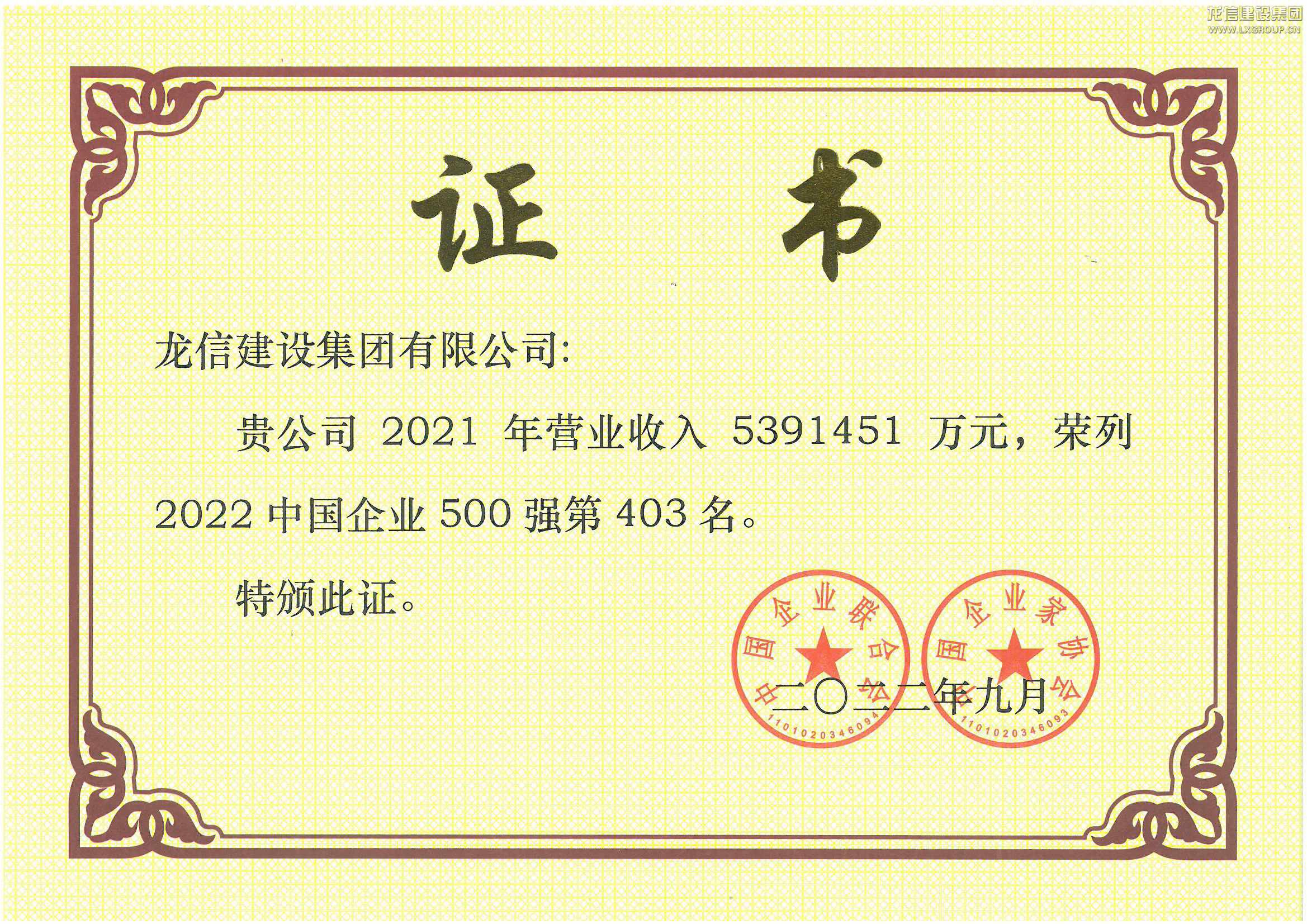 2022中國企業500強 第403位(證書)