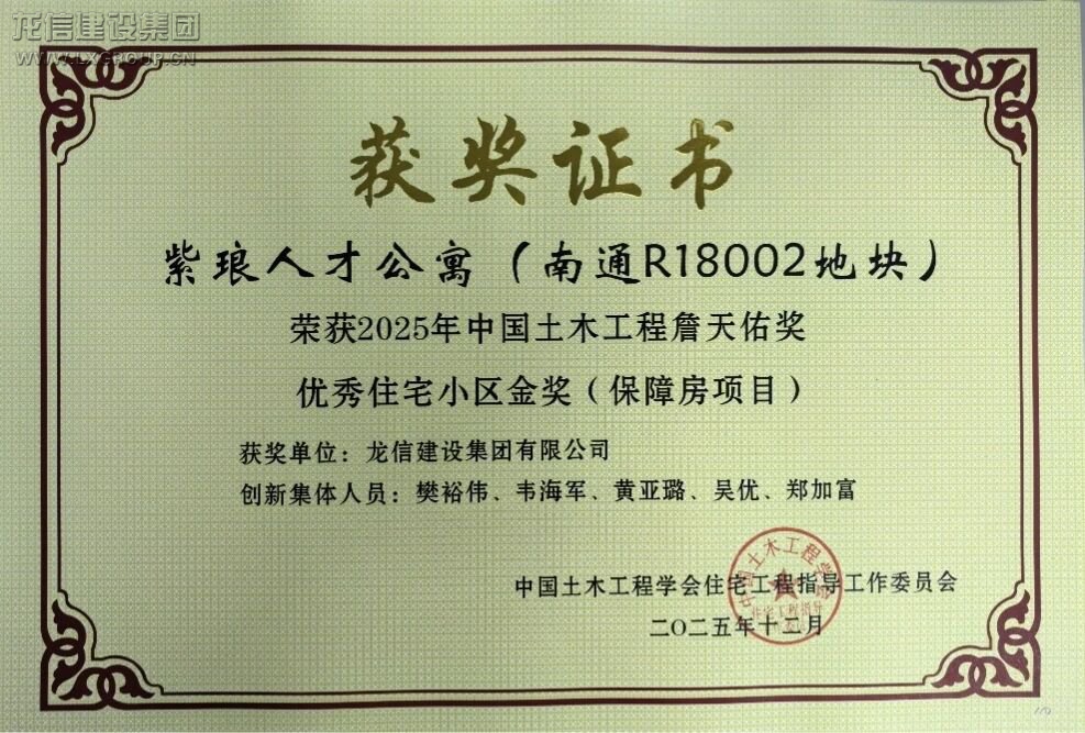 12月27日,2025年中國(guó)土木工程詹天佑獎(jiǎng)優(yōu)秀住宅小區(qū)技術(shù)交流會(huì)在北京召開。由龍信建設(shè)集團(tuán)承建的紫瑯人才公寓(南通R18002地塊)項(xiàng)目榮獲2025中國(guó)土木工程詹天佑獎(jiǎng)優(yōu)秀住宅小區(qū)金獎(jiǎng)。