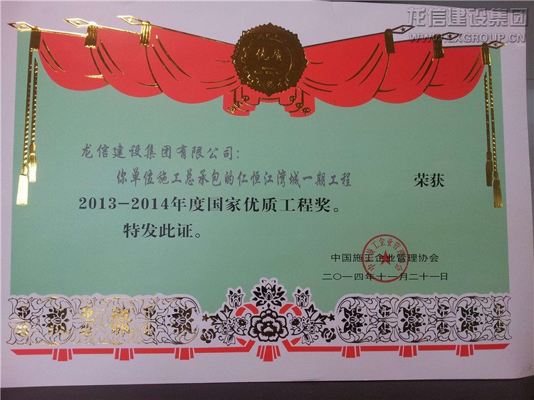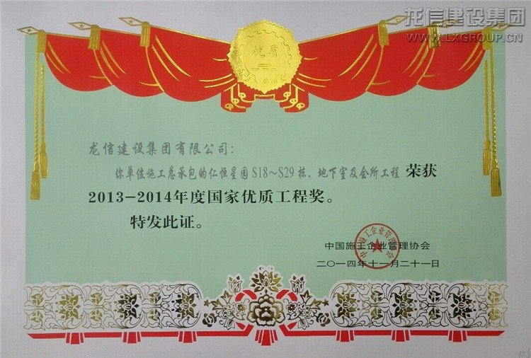 近日公司承建的“仁恒星園S18~S29棟、地下室及會所”、“仁恒江灣城一期工程”喜獲2013-2014年度“國家優質工程獎”,子公司江蘇紫浪裝飾裝璜有限公司承建的海門市東恒盛國際大酒店裝飾工程獲“2013-2014年度全國建筑工程裝飾獎”。