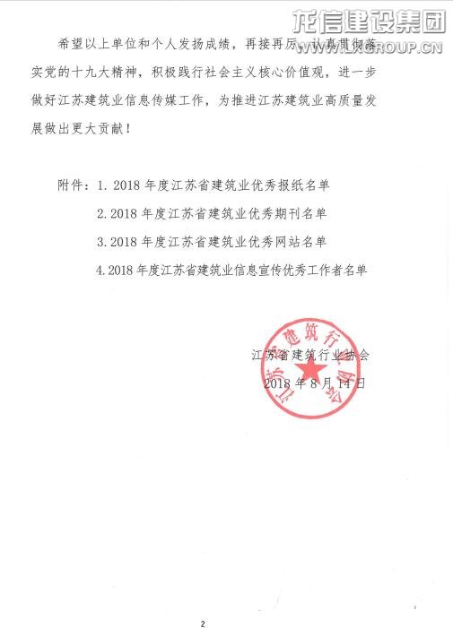 近日,江蘇省建筑行業協會公布了2018年度江蘇省建筑業信息傳媒工作競賽評審結果?!洱埿拧冯s志榮獲2018年度江蘇省建筑業優秀期刊,龍信網站(www.lxgroup.com)榮獲2018年度江蘇省建筑業優秀網站。
